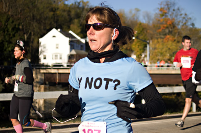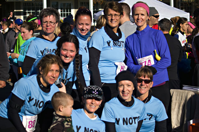 The “Y Nots” are the ladies I run with from the Y. This morning they ran the Scarecrow 5k…it benefited Safe Journey, which helps victims of domestic violence. I couldn’t run this time because I didn’t have anyone to watch Ben, but Mr. Ben and I headed out to cheer the ladies on and take pictures.